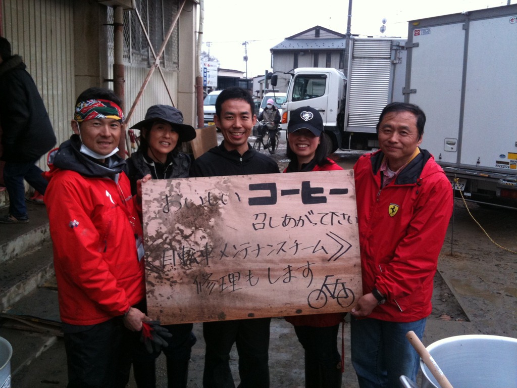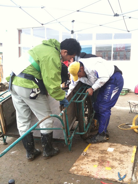 それにしてもプロの技というのはスゴイ。湊小で修理の陣頭指揮を取ったのはナルシマの鳴嶋 勇社長。自転車はもちろんのこと、持ち込まれるものなら何でも直す。自転車用の部材を流用してパンクしていたリヤカーも直す。ついでに持ち込んだ工具を現地の元自転車屋というおじいさんに提供し、今の自転車の修理の仕方をレクチャー。特に得意技もない僕は手が空いたら目の前の泥と土の山を書き出す他のボランティアのお手伝いをしたり、時々かかってくる電話や他のボランティアから(なぜか)いろいろ聞かれるのでそれを現地の担当者につないだりといったことをしつつ。