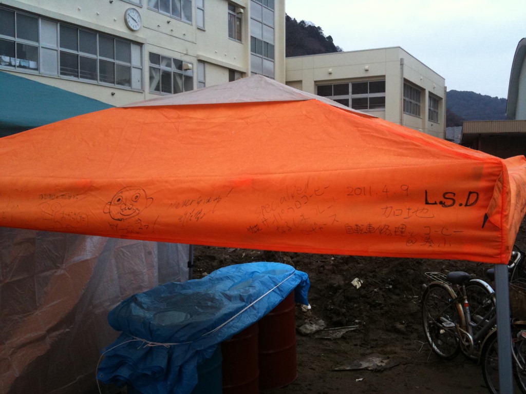気が付くと日暮れ時。だんだん人も車も減ってきてお仕事もなくなってきたので撤収。kajikuniさんが私物で持ち込んだテントを現地の担当者の希望で男前に提供。なぜかみんなで寄せ書き。こんなことしてると物見遊山気分で行くなとか言われそうだけど、現地の人たちからも「あんたらは楽しそうでいいね!」と言われたくらい、活動をしている僕ら自身がとても楽しんで作業したし、サービスを使ってもらった人にも喜んでもらったのでよかったと思う。大変な状況なのは誰が言わなくてもわかってるので、そんな中でもなんにでも楽しさを見出してやるってのが僕ら流。今回のボランティアで初めてご一緒した人も多かったけど、なぜかそう感じたし実際そう活動した気がする。