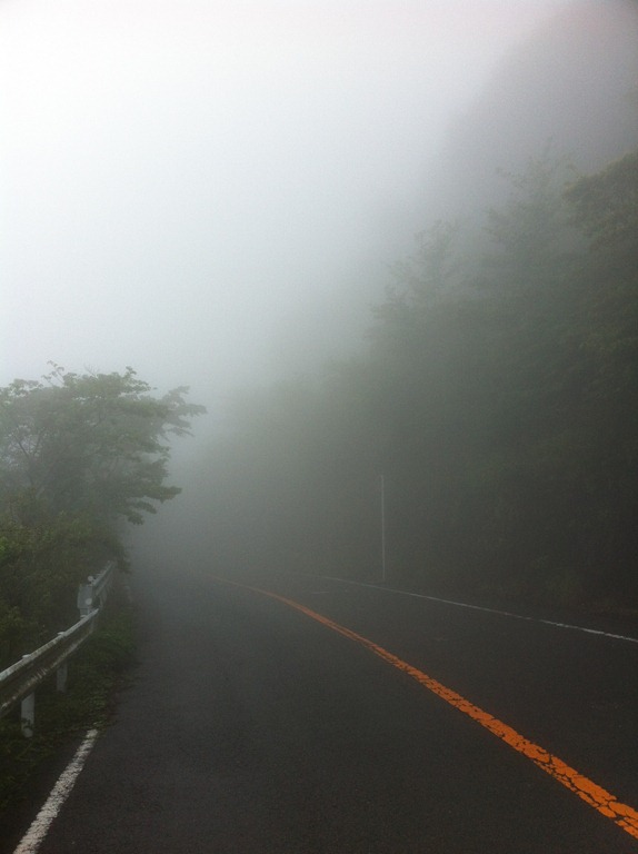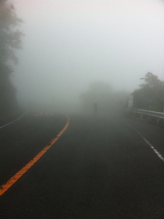 湯河原からは超まったりと大観山へ。ほぼインナーローしばりでおしゃべりしながらゆるゆると登ります。下界から見ていた通り、途中からは雲の中に突入して周囲は幻想的な乳白色の世界。前後左右10m先は真っ白でなんも見えません。汗もかいてないけど毛に水滴つきまくり。