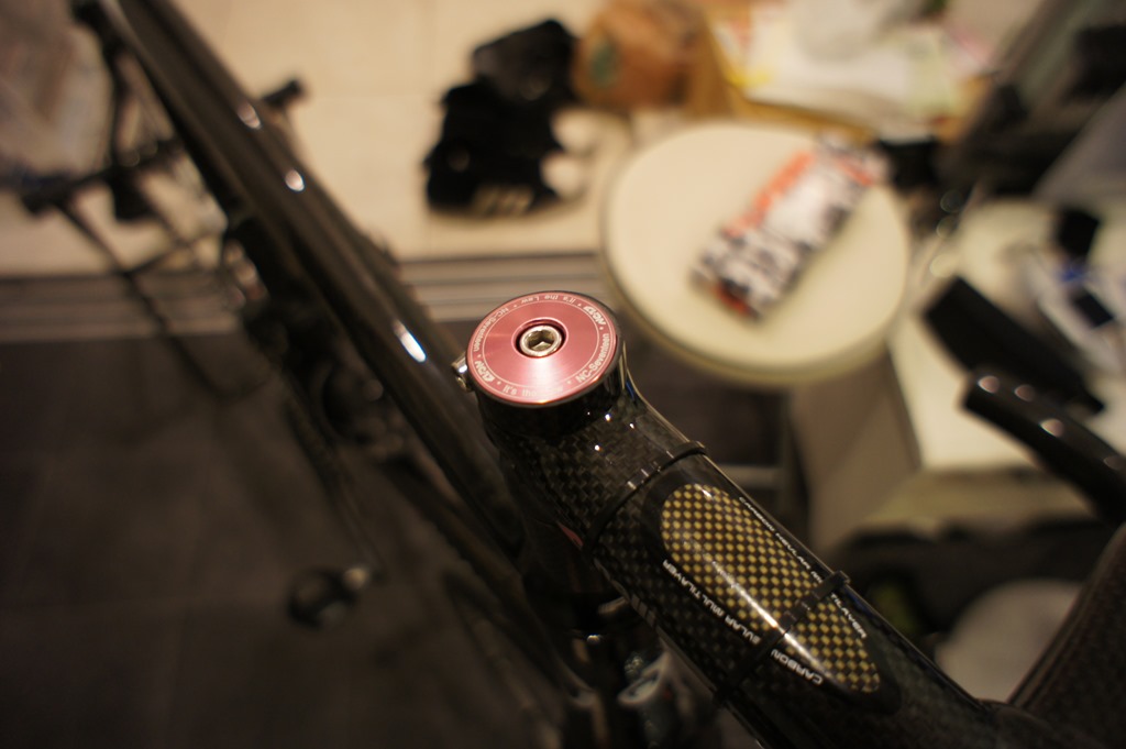 ステムがくっきり見えるも気持ちい。ハンドルステムに拘りがあるむきにはさらにいいのでは。ちなみに僕もそう。わざわざ揃えてるので(ヘッドキャップはこれだけ別に探して購入したのですよ!)このへんは本来すっきりさせたいところ。まぁこの後でレヴュー中のポタナビを装着するんですがw