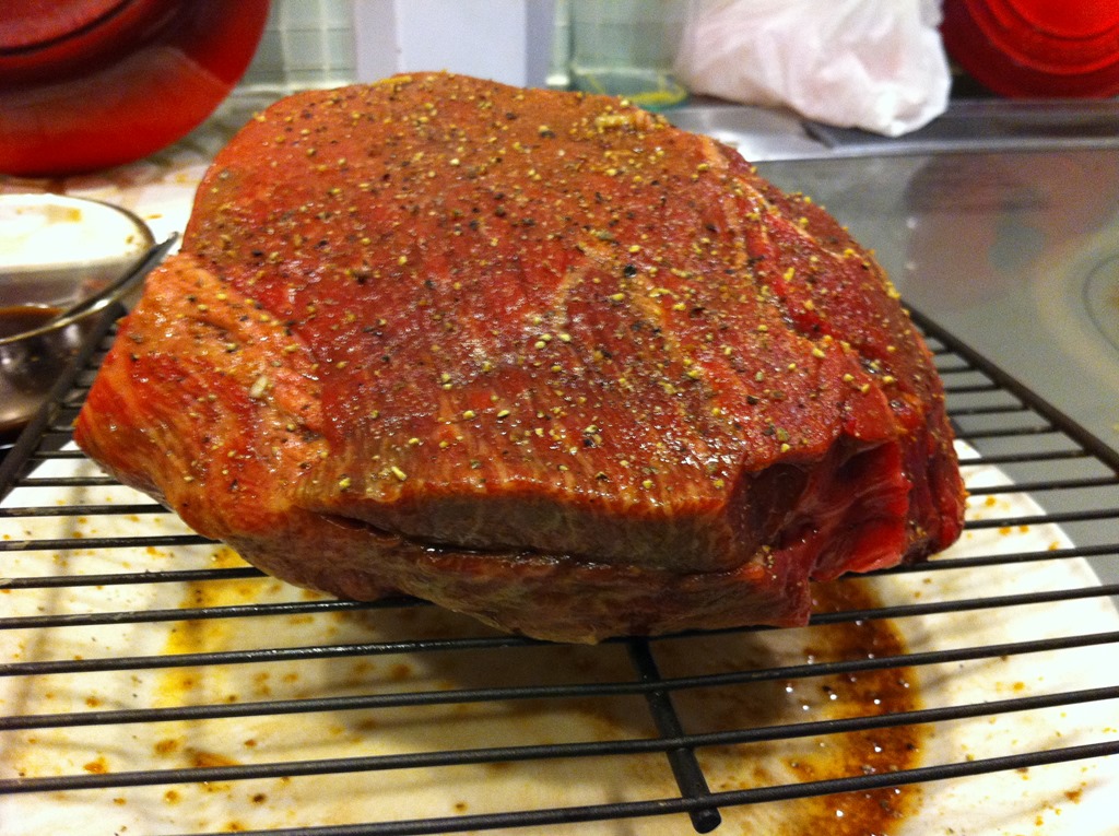 我が家で肉会。ヘルシオ(わりと初期型)のオーブン機能で1.2kgの肉塊をこんがりとロースト。