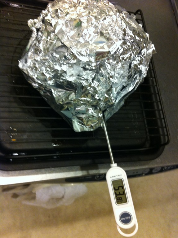 オーブンは予熱して170℃から。10分おきに肉の中心部の温度を計測。50度を超えたら取り出してアルミホイルで包んであとは余熱で調理。温度計は刺したままで変化を見守る。