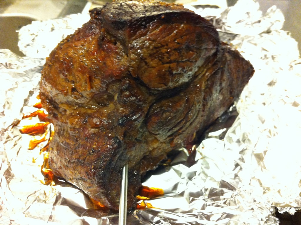 この間温度変化をみつつホイルを1枚剥がしたり、2枚剥がしたり、最後は全部取ってじっくりと余熱調理。外はごらんの通りコンガリ。とんでもなくよい匂い。