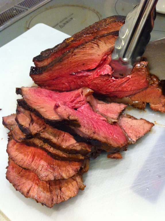 今回は60℃に達した時点で調理終了、で切り分ける。最後に肉汁とタレの残りで作ったソースをかけて頂く。