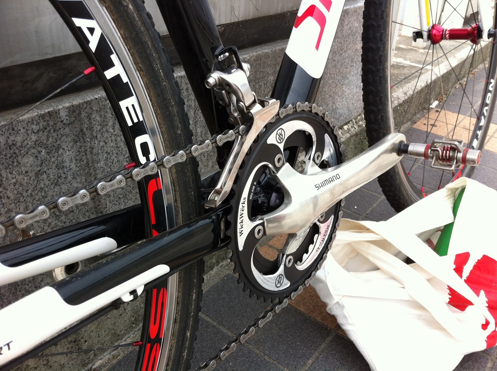 とりあえず去年買っておいた44-36にチェーンリングを換装。今まではロードの昔使ってたコンパクト(50-34)をそのまま使ってたので、アウターは小さく、インナーは若干大きく。アウターの上の方ってCXではほぼ使う機会がなかったので、44にしたら少しは使うことができるかなと。あと辻講習会で習ったのは、わりと重めのギアを体重載せて踏めということだったので、インナーにしても1つか2つギアかけて踏めるようにしたいところ。