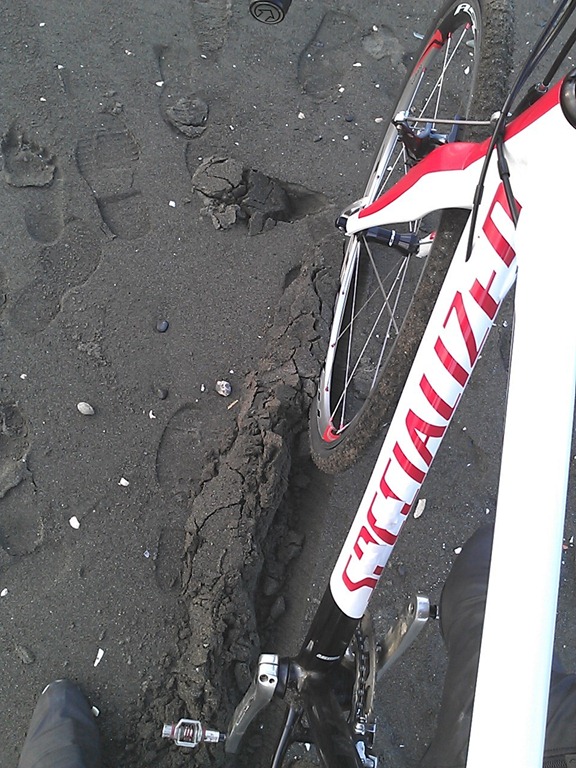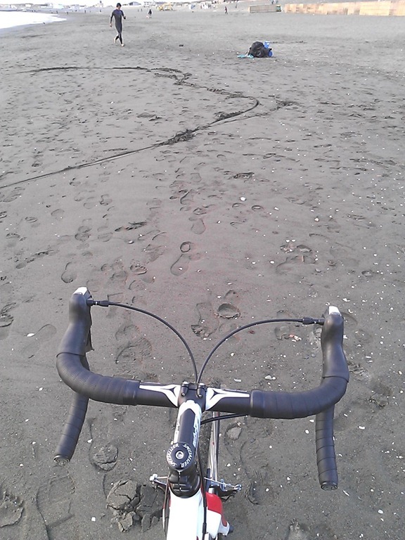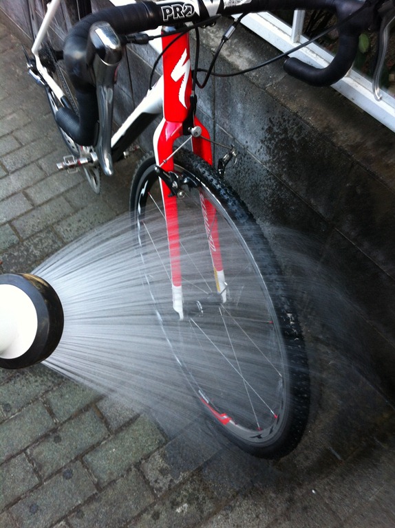 着替えが終わったら洗車。持ち込んだブラシと水でごしごしと。でもここで落とすのは車に積むときに泥が落ちることがない程度に見えている泥を落とす程度。どうせ細かい汚れは本洗車しないとダメなので、帰宅後。軽くささっと。洗い終わった自転車はひっくり返して乾燥させておくと社内が濡れないかも。
