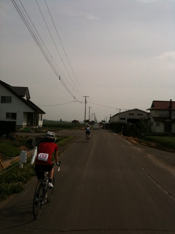 どうにもならないんだが脚を止めるわけにもいかないのでひーこら言いながら亀の走りで前に進む。そうこうするうちに 210km の先頭が追いついてきた。すでにバラバラになっていて集団ではなかったので、豪華メンツを見ながら相変わらず亀。登り切ってからアップダウンぽい区間をヘロヘロしていると後ろから 210km と 140km の混成追走集団が追いついてきた。その中に masahif と jmz の姿が!追走だよ~と声をかけてもらったのだけど残念ながらその時点ではまったくペースを上げられず。行ってくれ~がんばって~と声をかけてお別れ。また単独に。